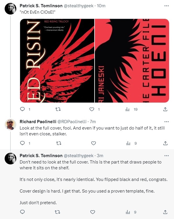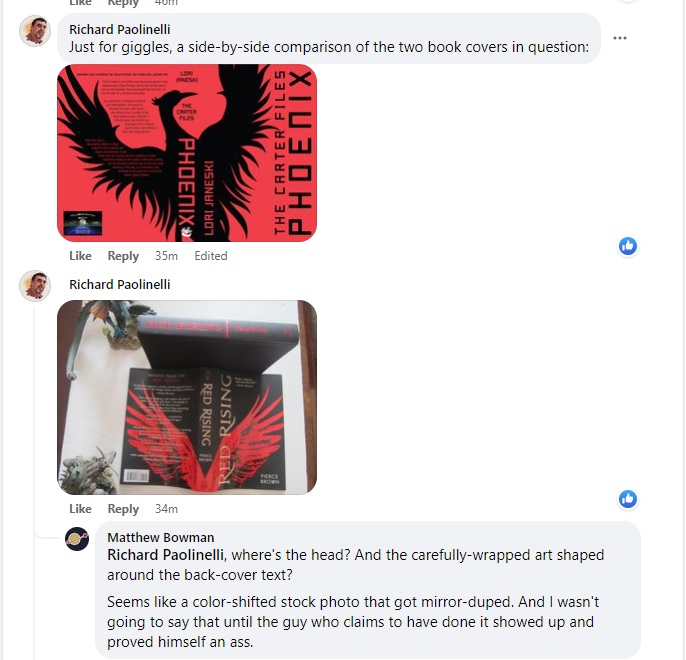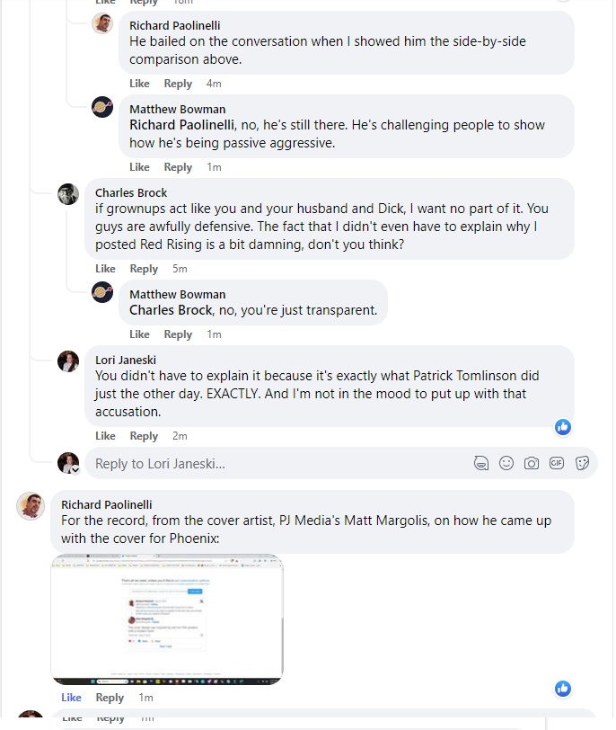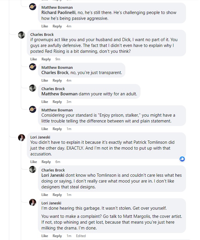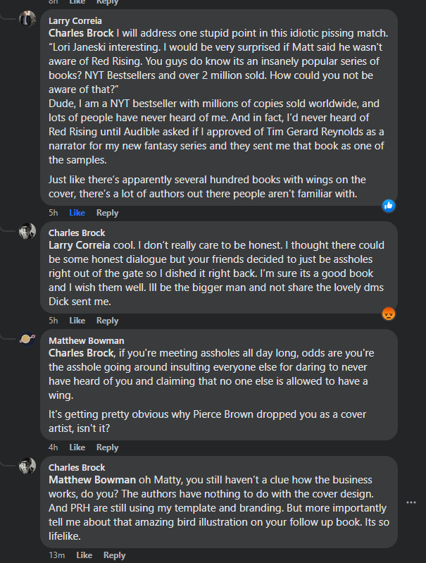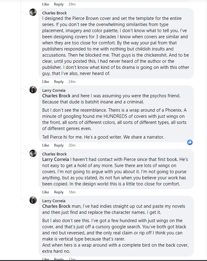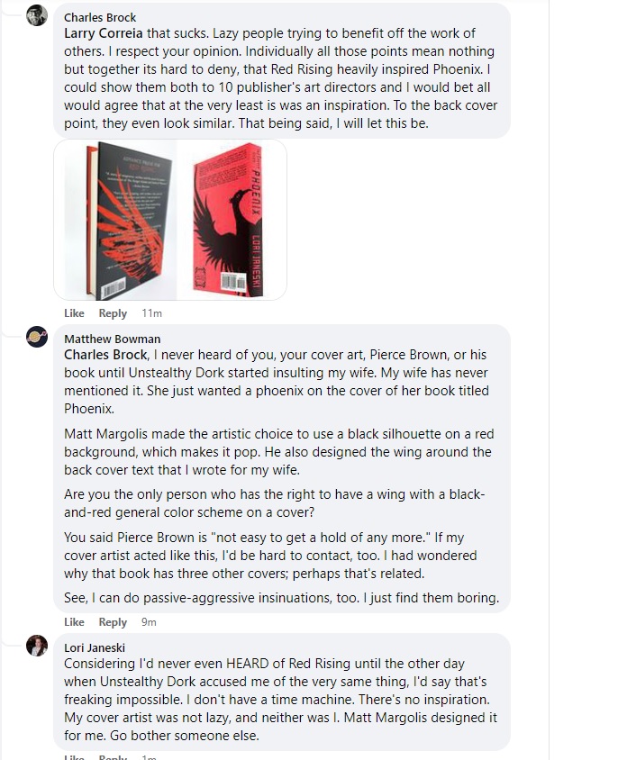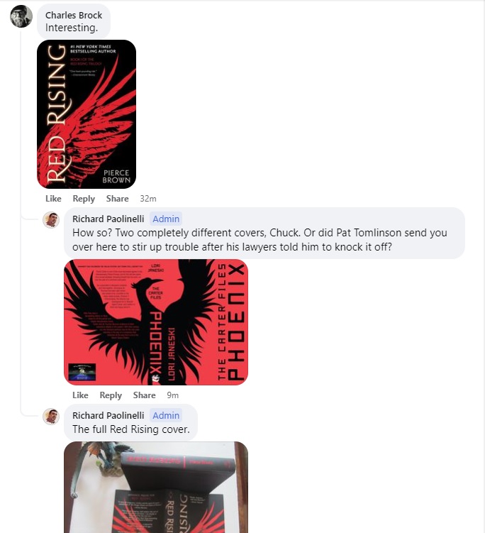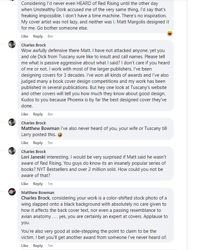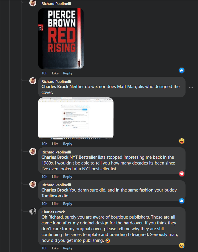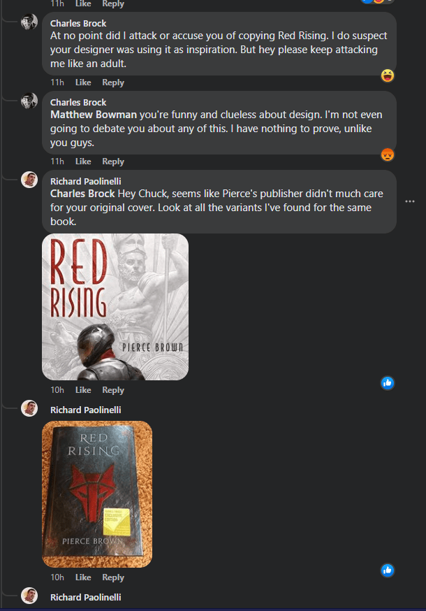 Turns out, the original artist for the Red Rising cover I was accused of stealing (Charles Brock) somehow found this, not only on Larry’s thread, but on the Tuscany Bay Books thread as well. He did the exact same thing in both locations, which was very strange to me. It seemed like he’d been deliberately sent over here by Tomlinson, even though he denied knowing the guy. We’ll probably never know whether he was lying or not, and it doesn’t matter, because the result was the same.