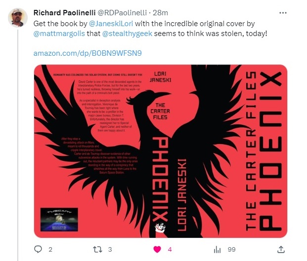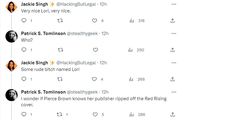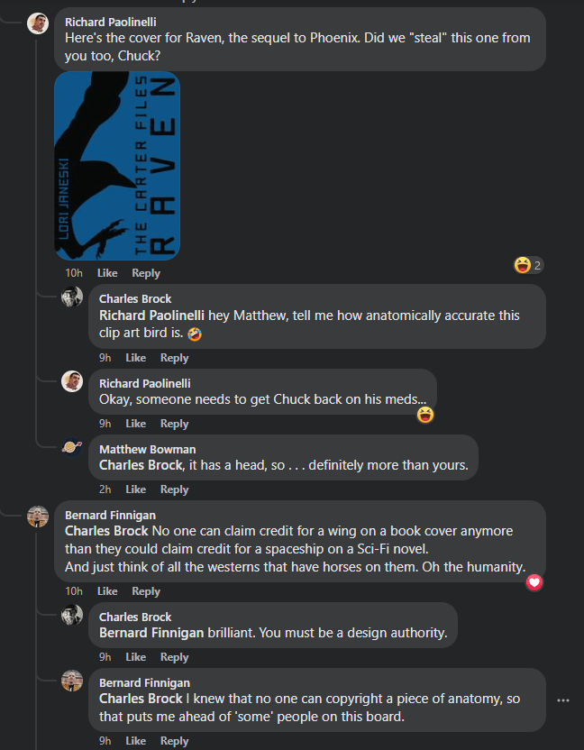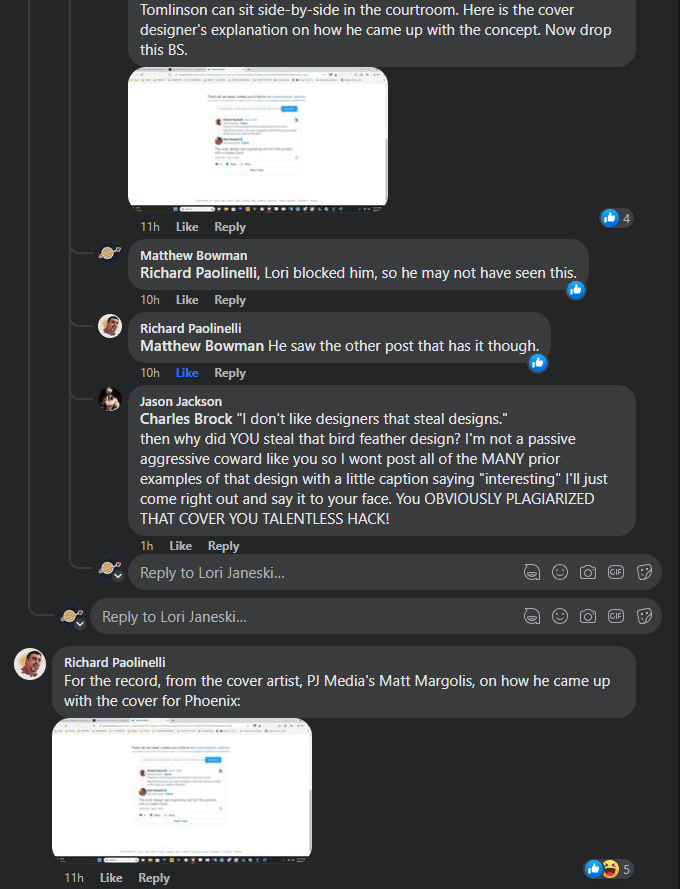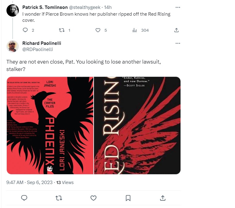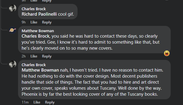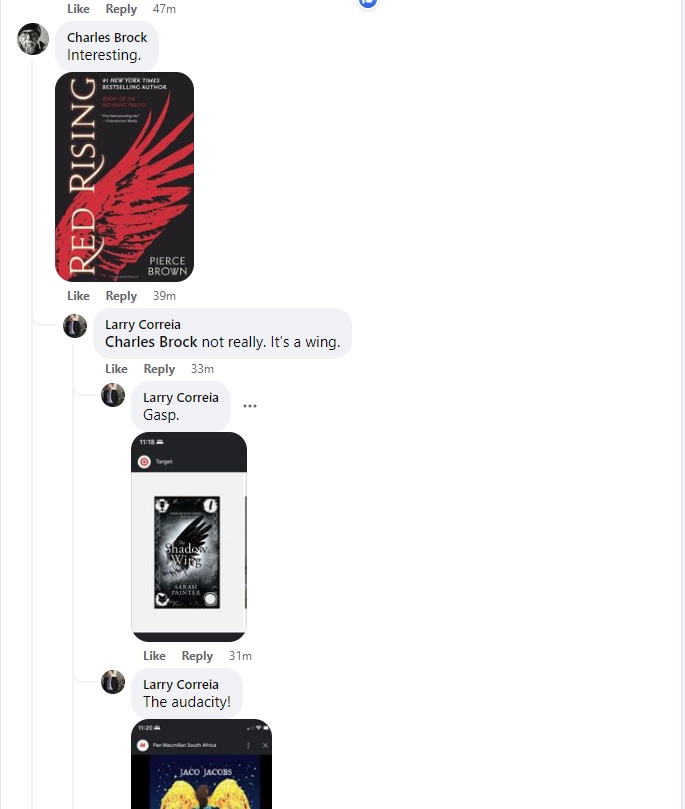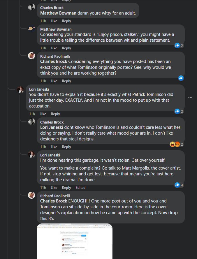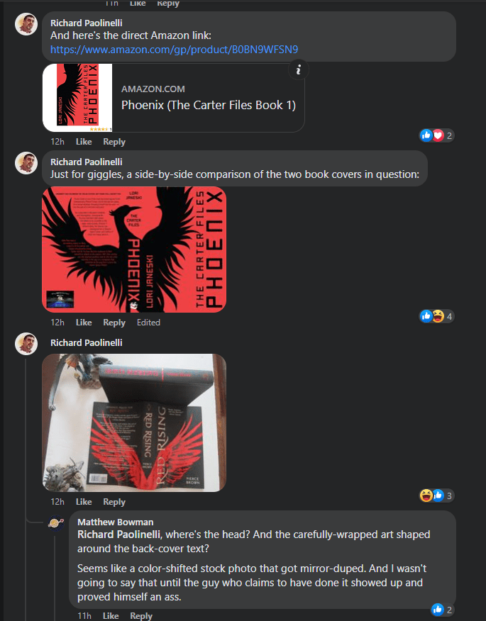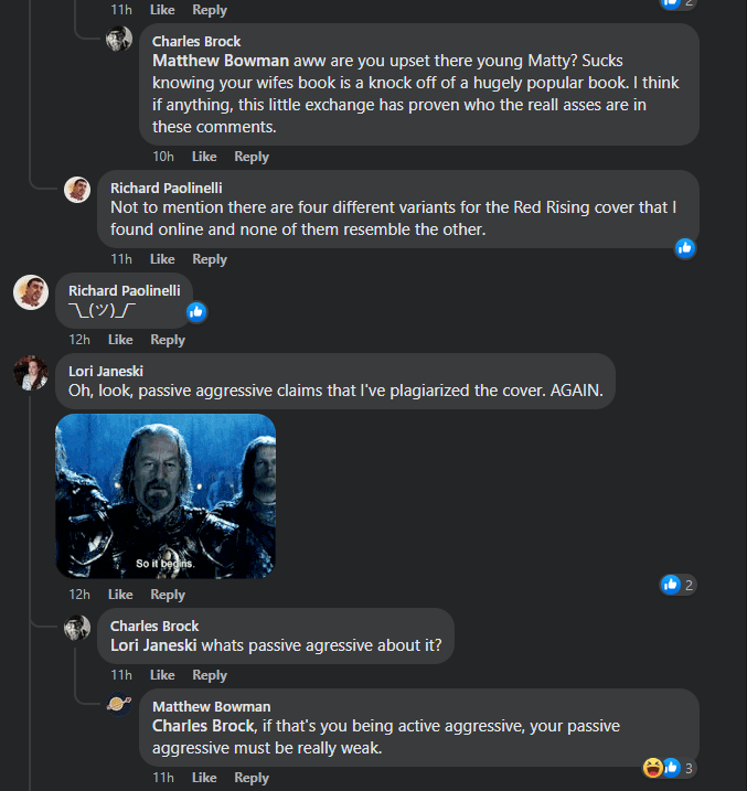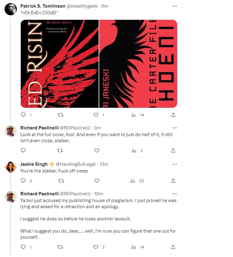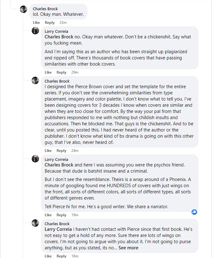 Turns out, the original artist for the Red Rising cover I was accused of stealing (Charles Brock) somehow found this, not only on Larry’s thread, but on the Tuscany Bay Books thread as well. He did the exact same thing in both locations, which was very strange to me. It seemed like he’d been deliberately sent over here by Tomlinson, even though he denied knowing the guy. We’ll probably never know whether he was lying or not, and it doesn’t matter, because the result was the same.