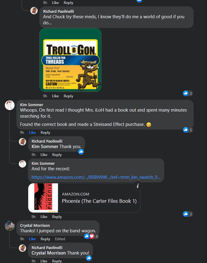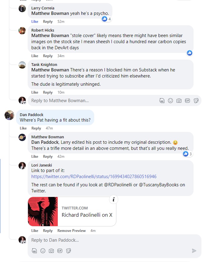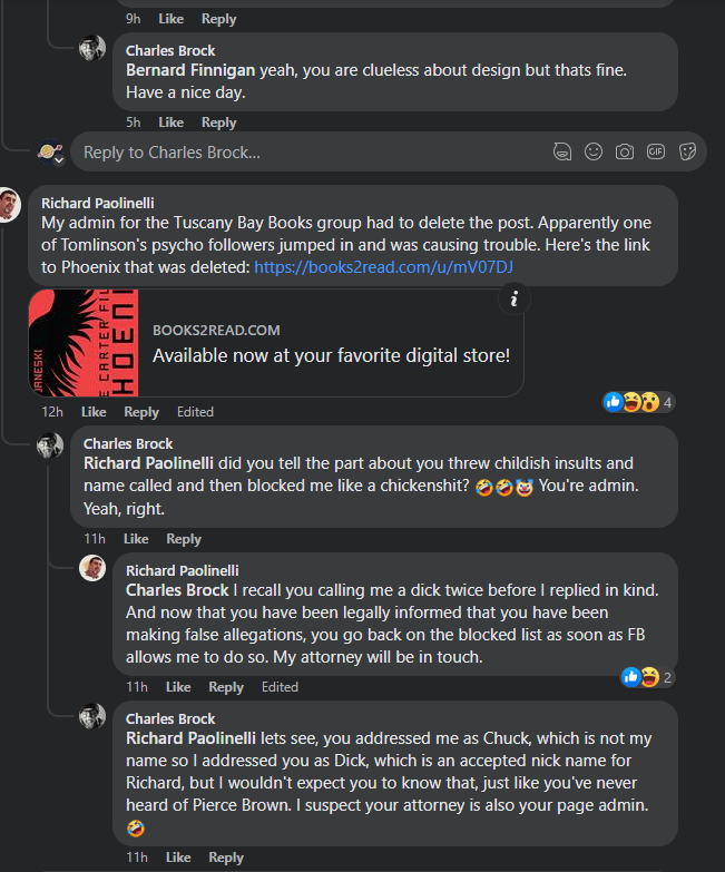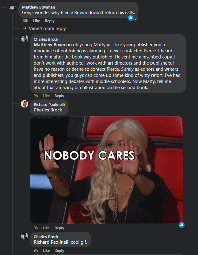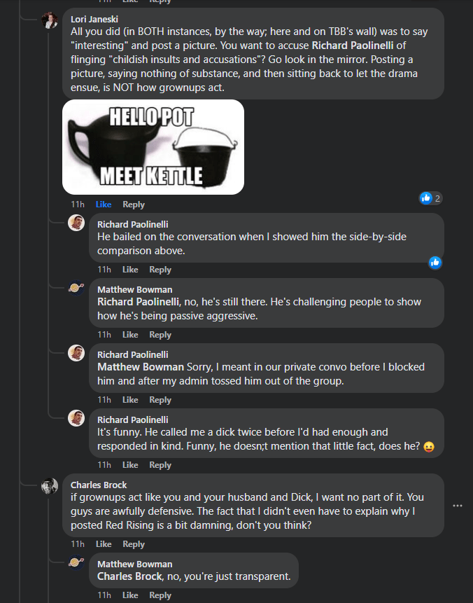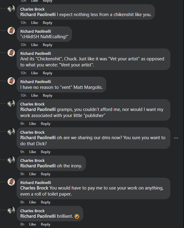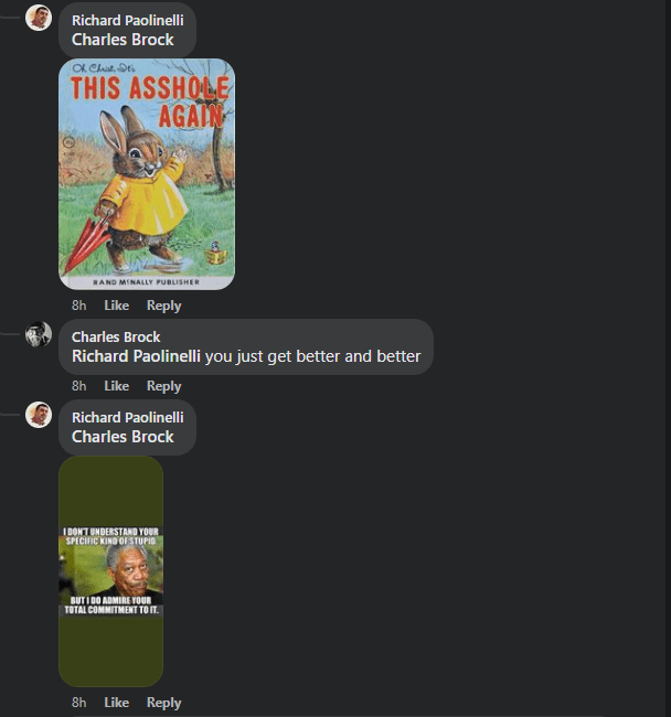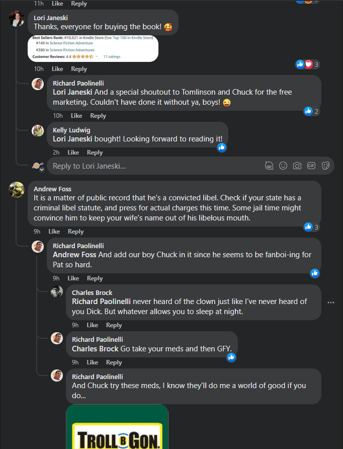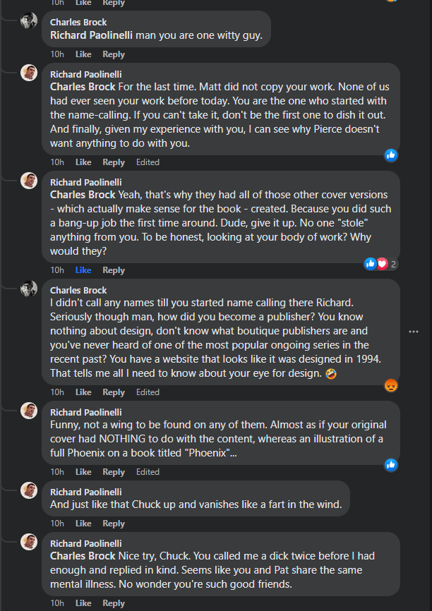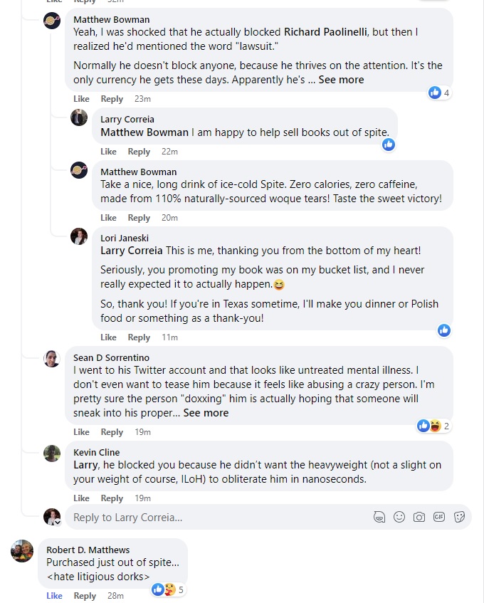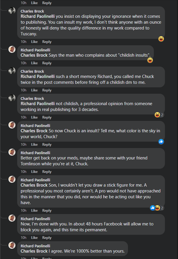 Once again, Paolinelli with the shutdown win. This guy even had more, but I had to use Husband’s account to see all of it, as I’d blocked him after that (yes, I know, I should have gone with the “you can’t hurt me, you’re a troll” tactic, but by this point, I’d basically had enough of being accused of stealing). So, the rest of Chuck’s vitriol was limited to childish insults, for which Larry’s followers slapped him hard enough to make his grandchildren’s ears ring (this starts immediately after I said I was done with his garbage; that he should make an official complaint or shut up). Even Larry personally weighed in on this one, and not even THAT shut him up.
