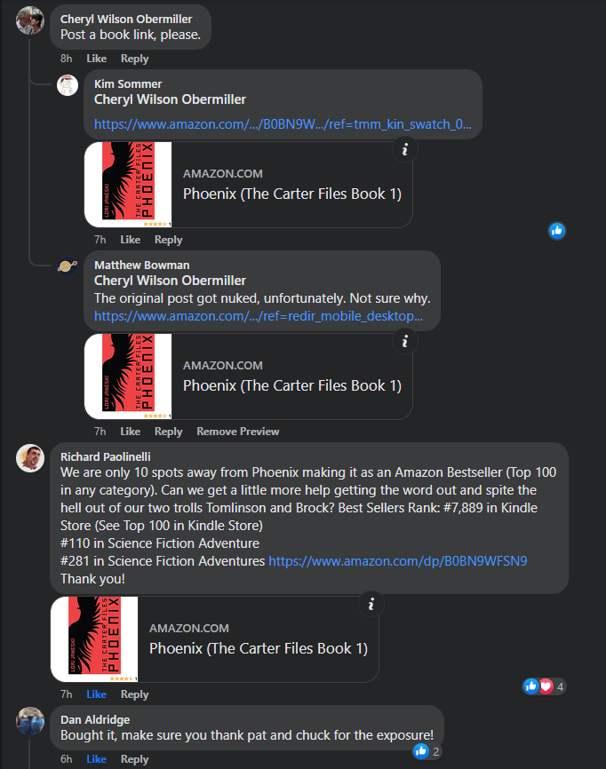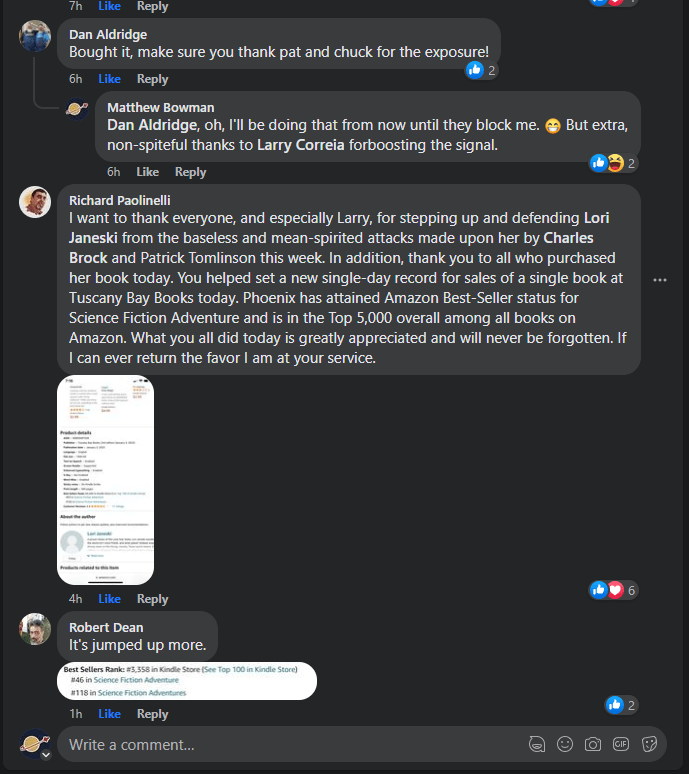 Then it was time for a victory lap. After all the above garbage, my publisher told me exactly what the results were, using the Amazon rankings for the book. Thanks to Larry and his fans, I made it up to #46 in Science Fiction Adventure, and Paolinelli of course shared that around.