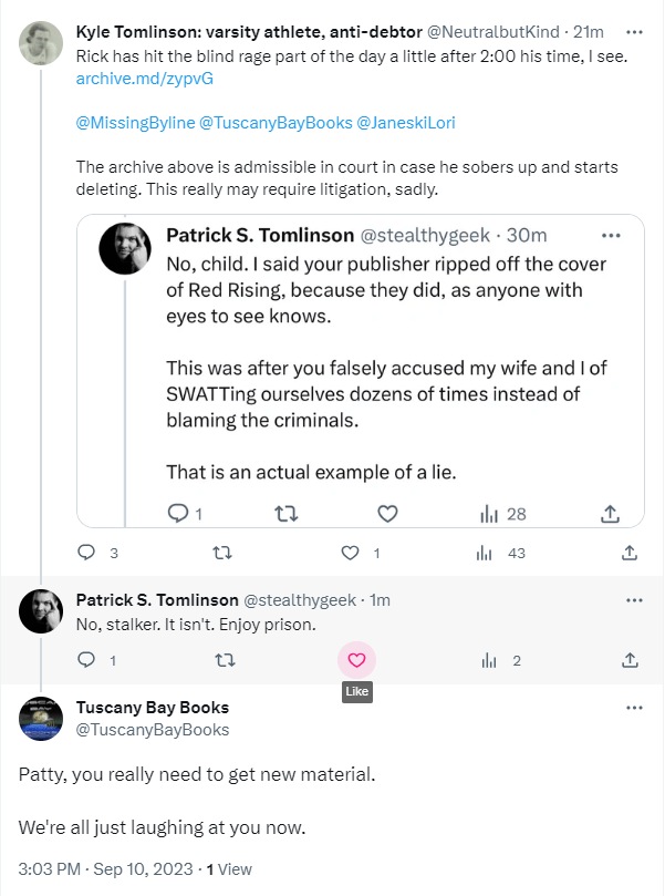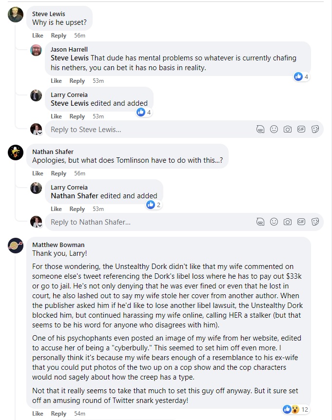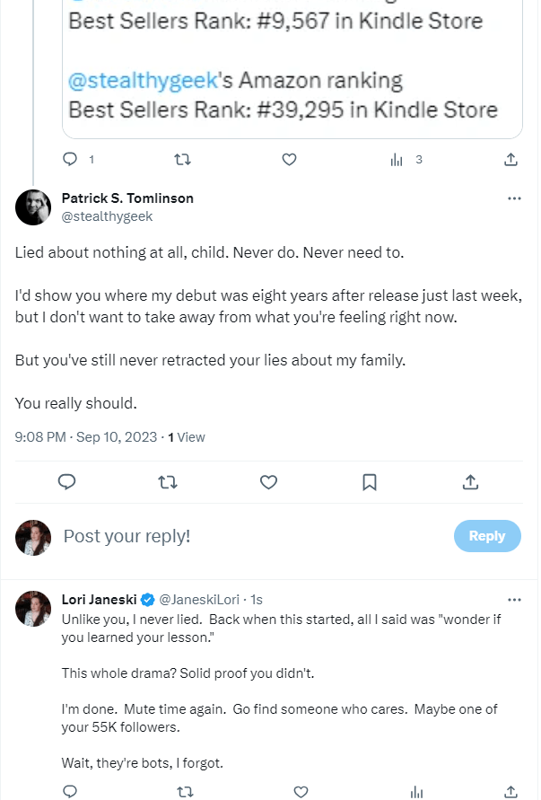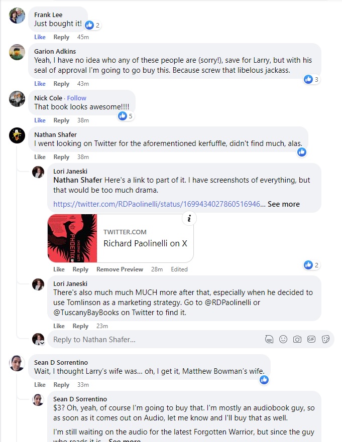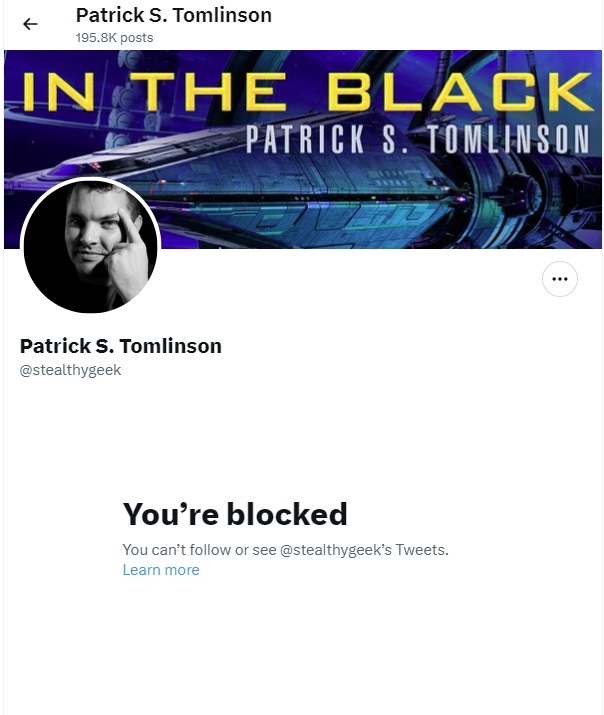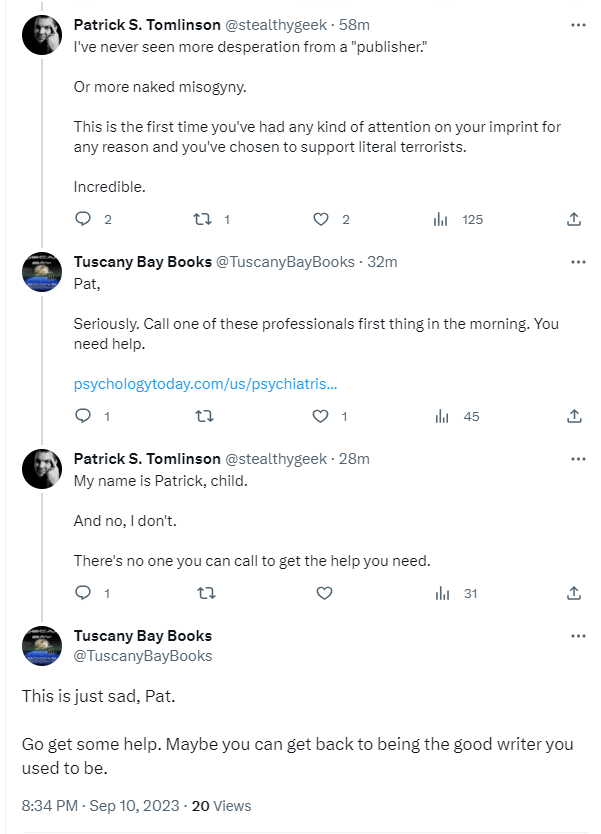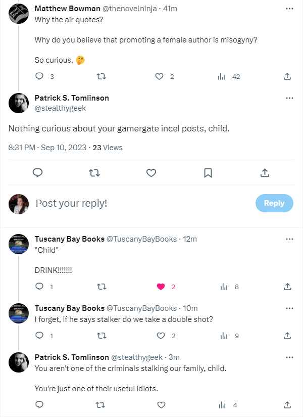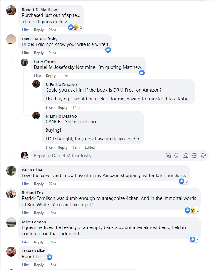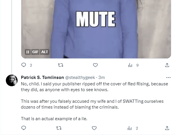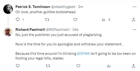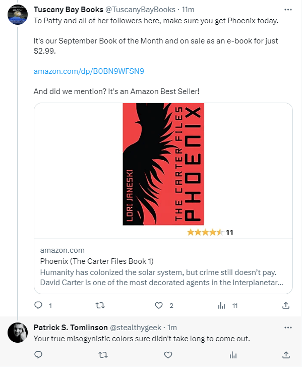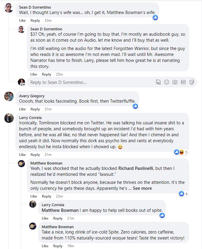 There is a point to this long post, and it isn’t just slamming Tomlinson. This is the first time this has happened to me, and the scale of it reached well beyond what I had expected. Between my publisher and Larry Correia, this thread and the related ones got so many eyeballs on it, my Twitter feed was exploding for days on end.
