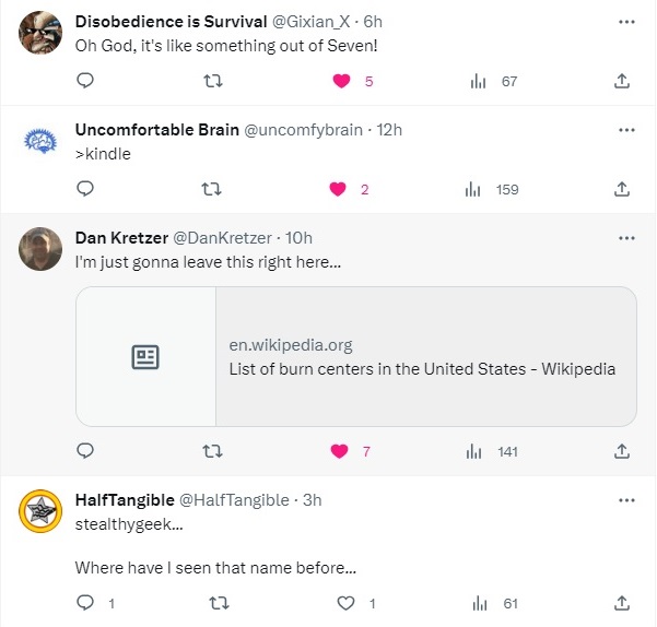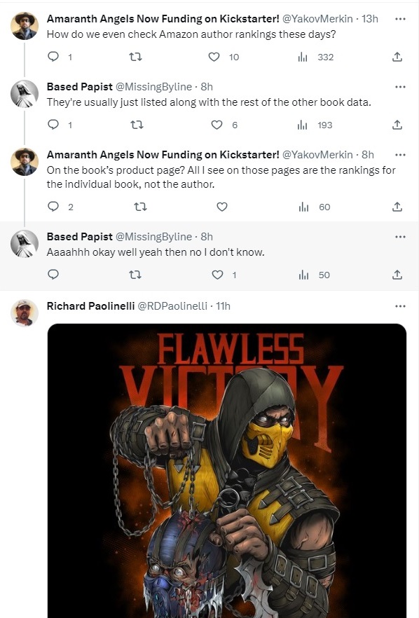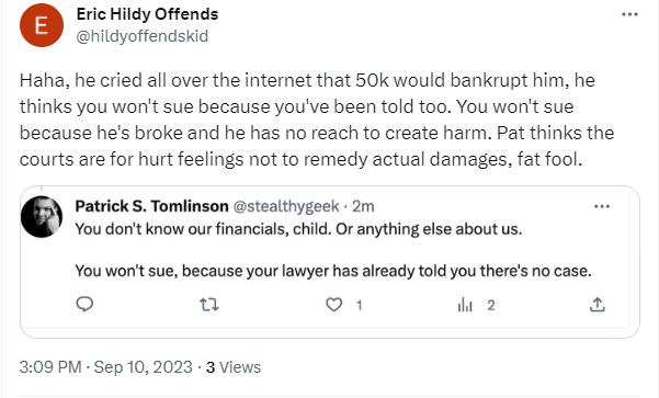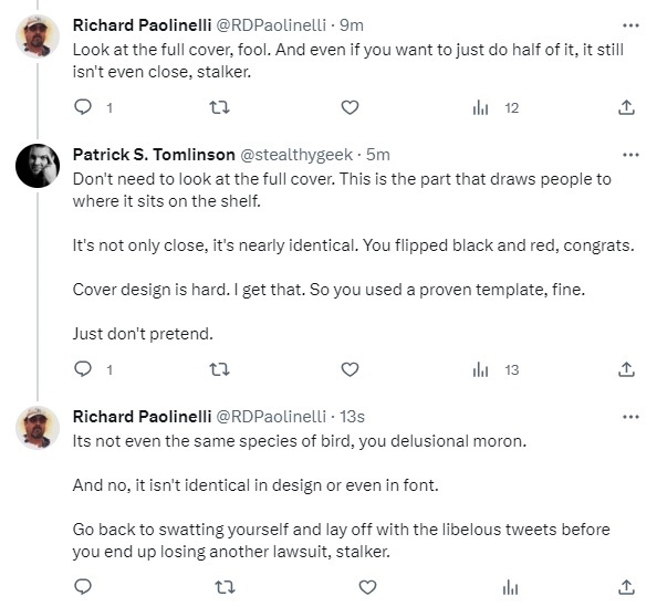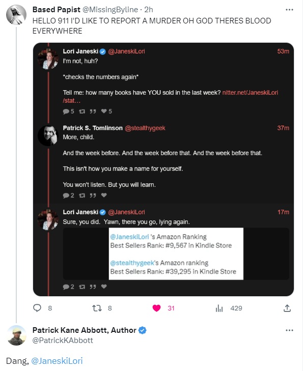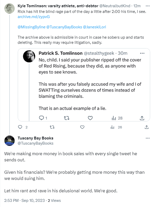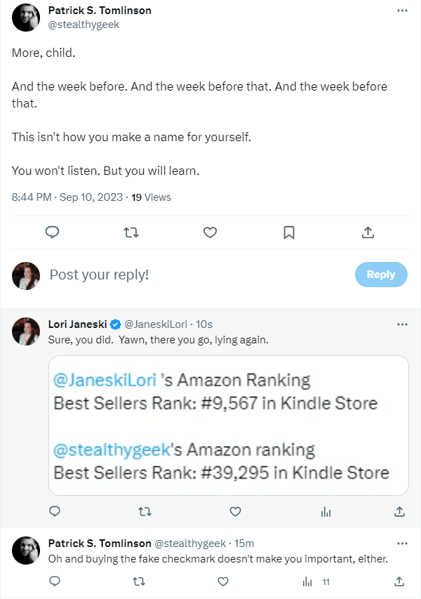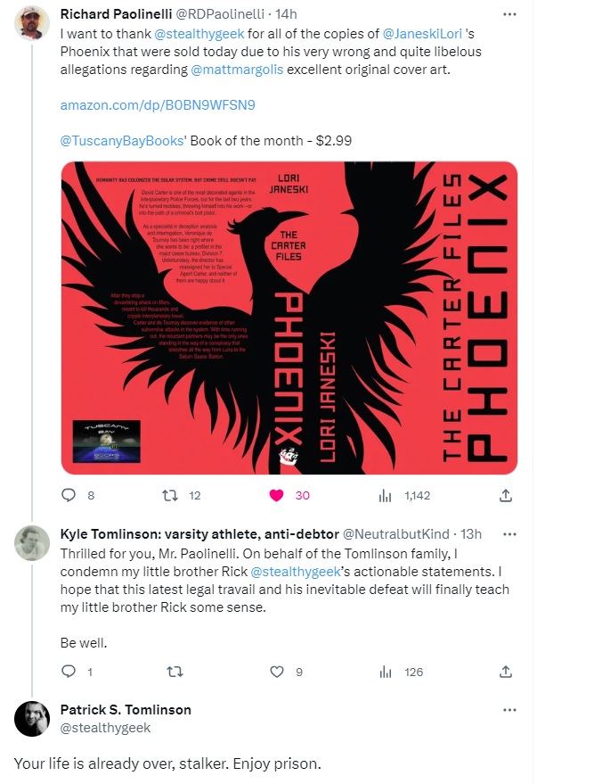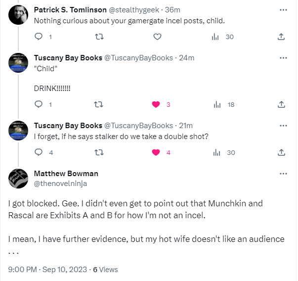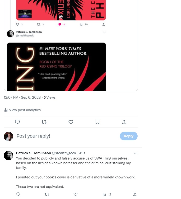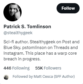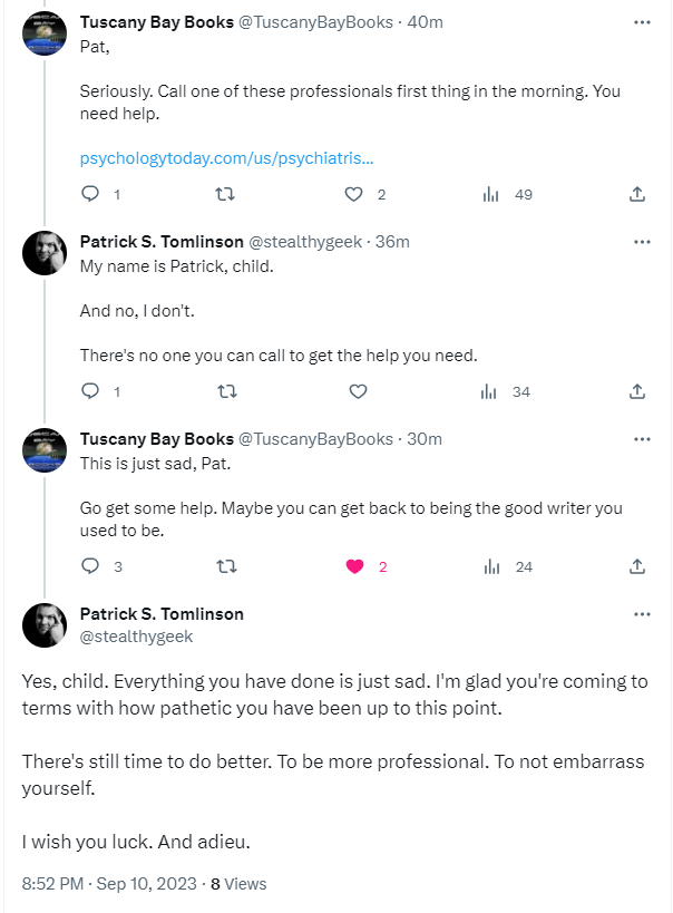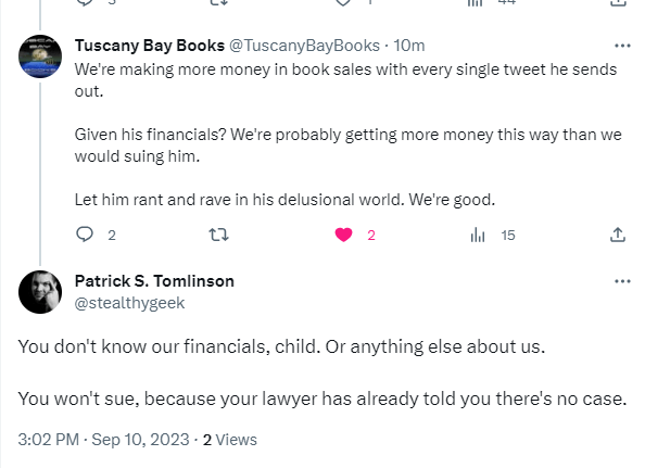 There is a point to this long post, and it isn’t just slamming Tomlinson. This is the first time this has happened to me, and the scale of it reached well beyond what I had expected. Between my publisher and Larry Correia, this thread and the related ones got so many eyeballs on it, my Twitter feed was exploding for days on end.