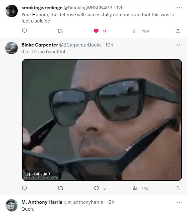 Throughout this whole thing, I was wondering where his followers were. Whenever Larry Correia slaps down a troll on the internet, his fans come out of the woodwork to laugh and participate. Supposedly, Tomlinson has more than double the number of Larry’s followers.