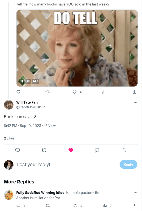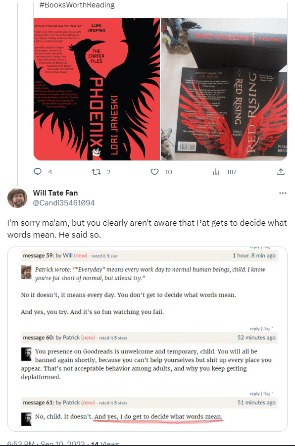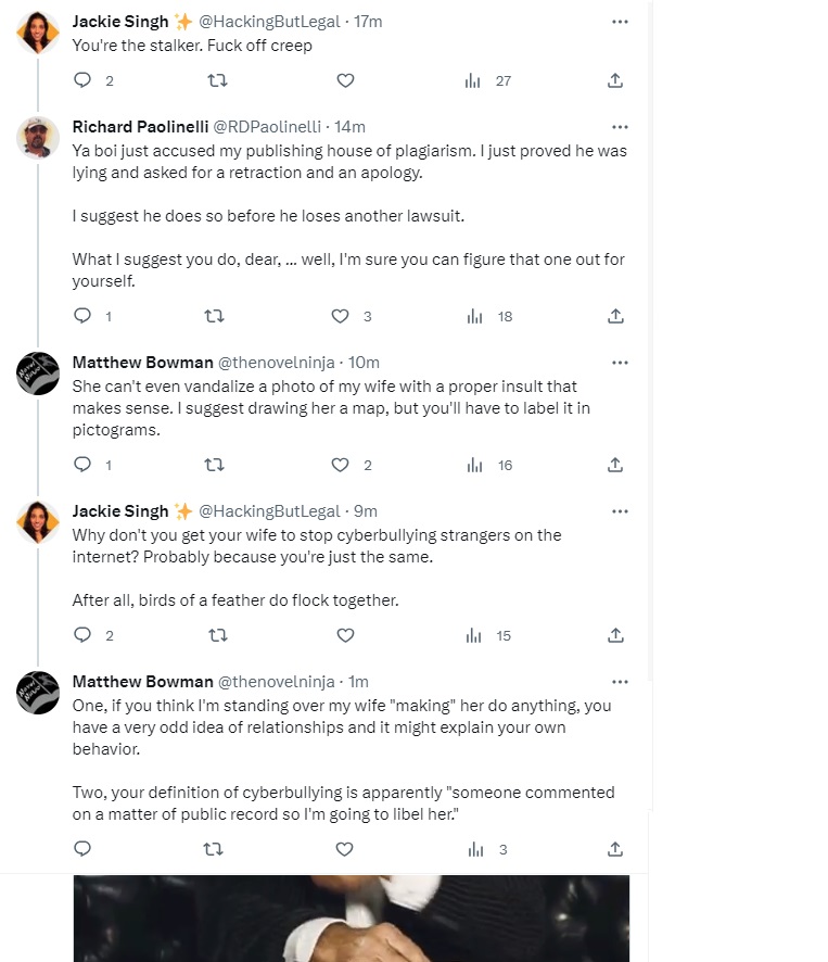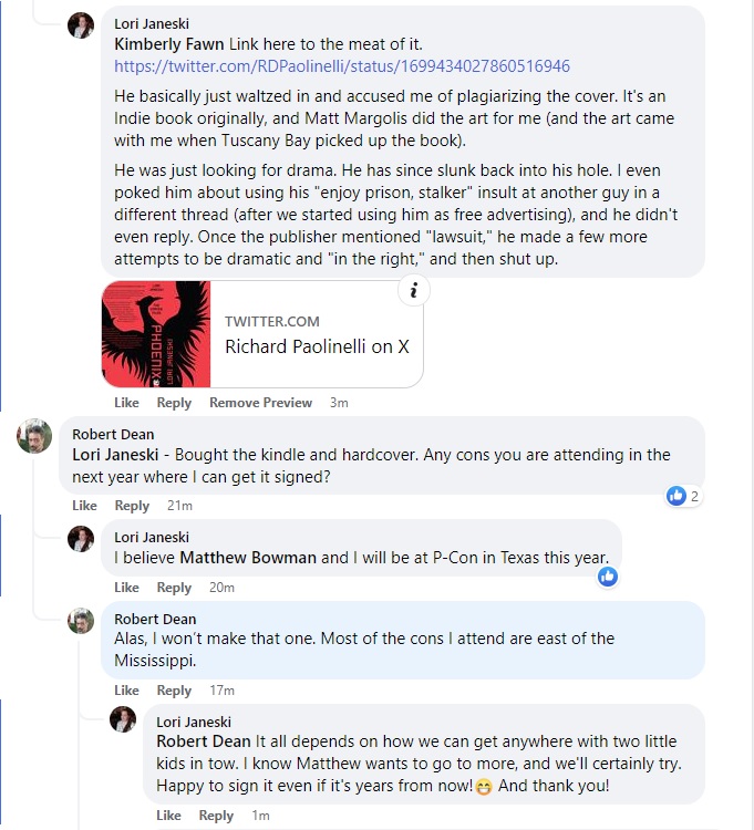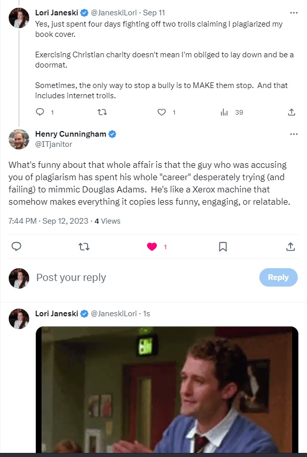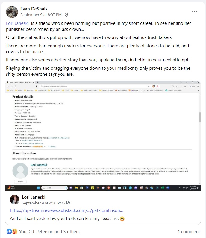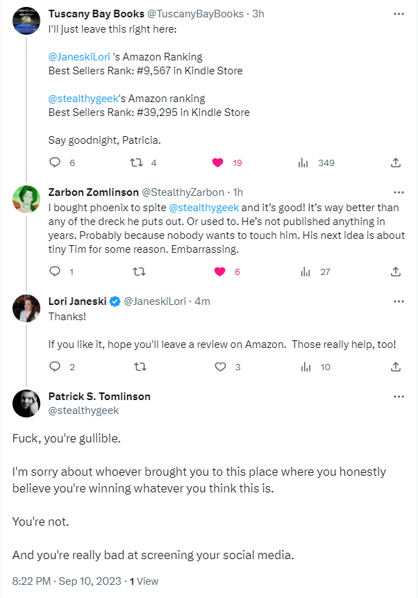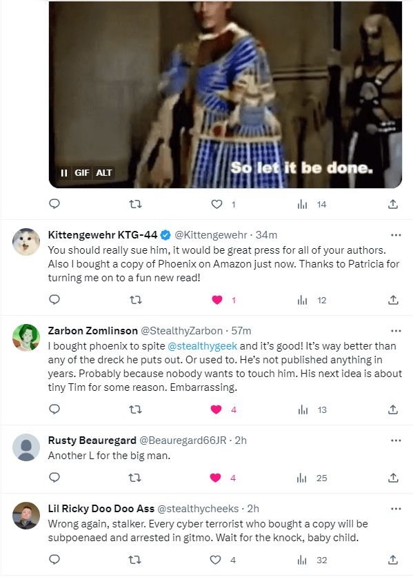 There are several screenshots in that thread, too, and I’ll put them all together, as close to chronological order as I can. I was staying out of it, and letting Husband and my publisher do most of the troll-slapping.