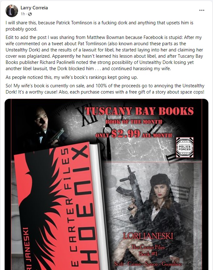 Meanwhile, this whole thing is getting shared everywhere, and my sales and Amazon rankings are going up. Then something happened that I can now check off my bucket list: Larry Correia shared a post to promote my book.
