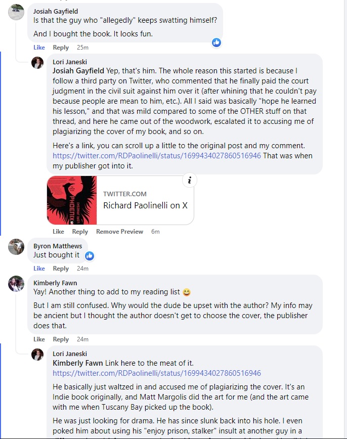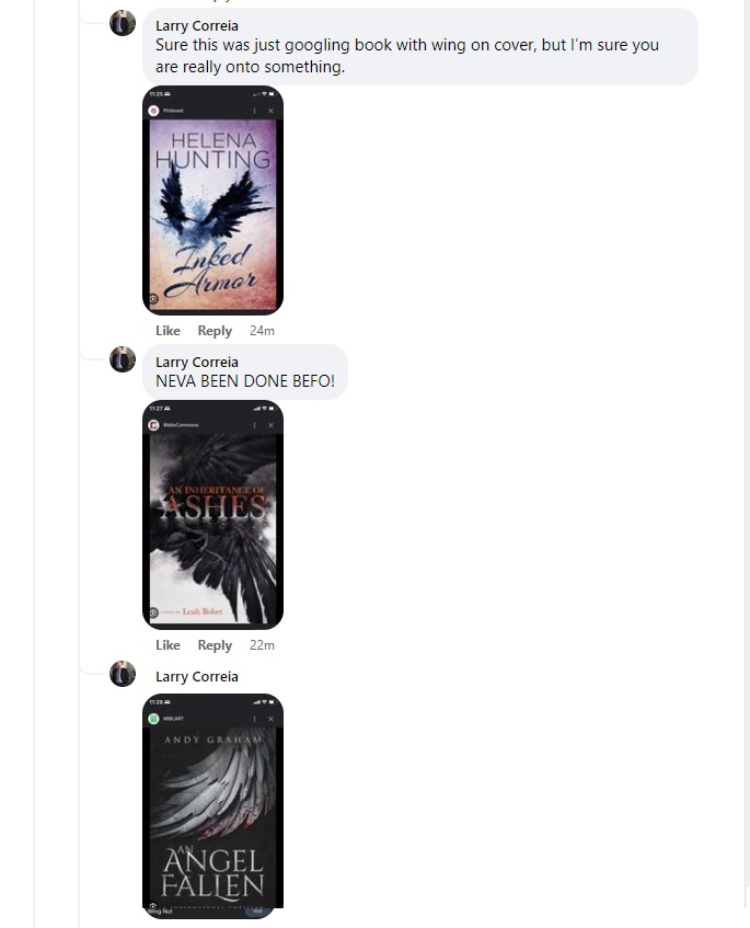 I muted several conversations to turn off his vitriol (the internet equivalent of walking away, I’d say), and contrary to his accusations, I never once told a lie about him, or accused him of doing anything other than lying about me and my book cover (which could be proven to be true; the reason I screenshot everything I could).