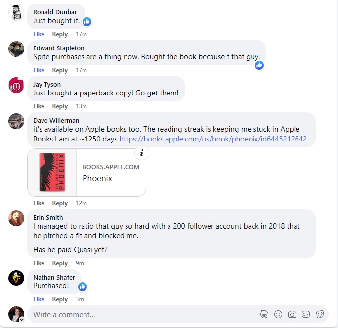 I saved those for last, because they’re the reason for all this. I’d be lying is I said I wish this hadn’t happened (I sold more books this week than I had since it was published back in January, by several orders of magnitude), but a small part of me wishes it had been more positive, and not because a few people were being assholes on the internet.