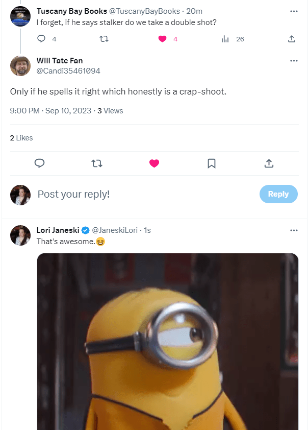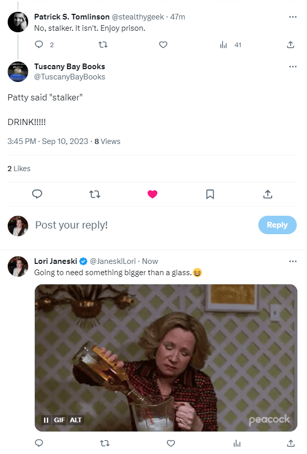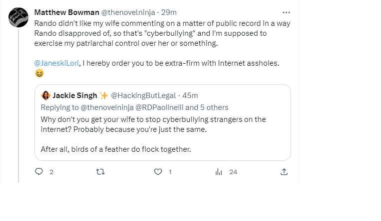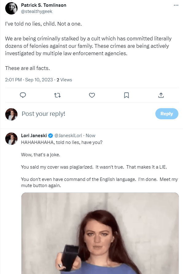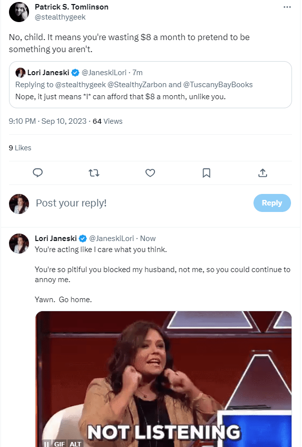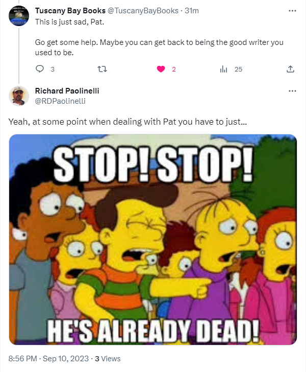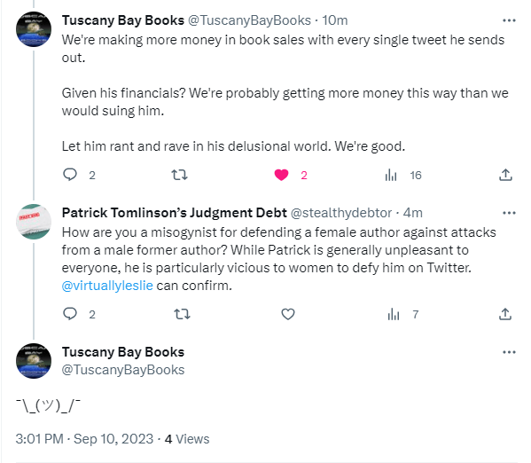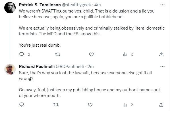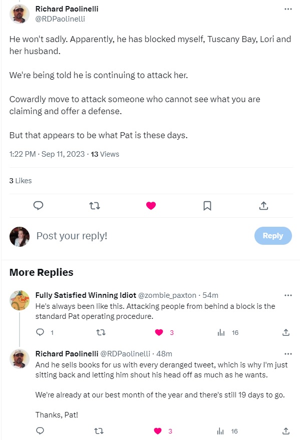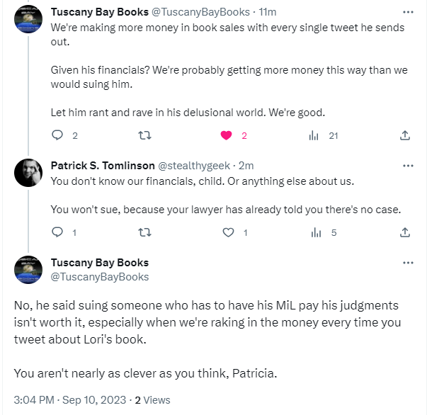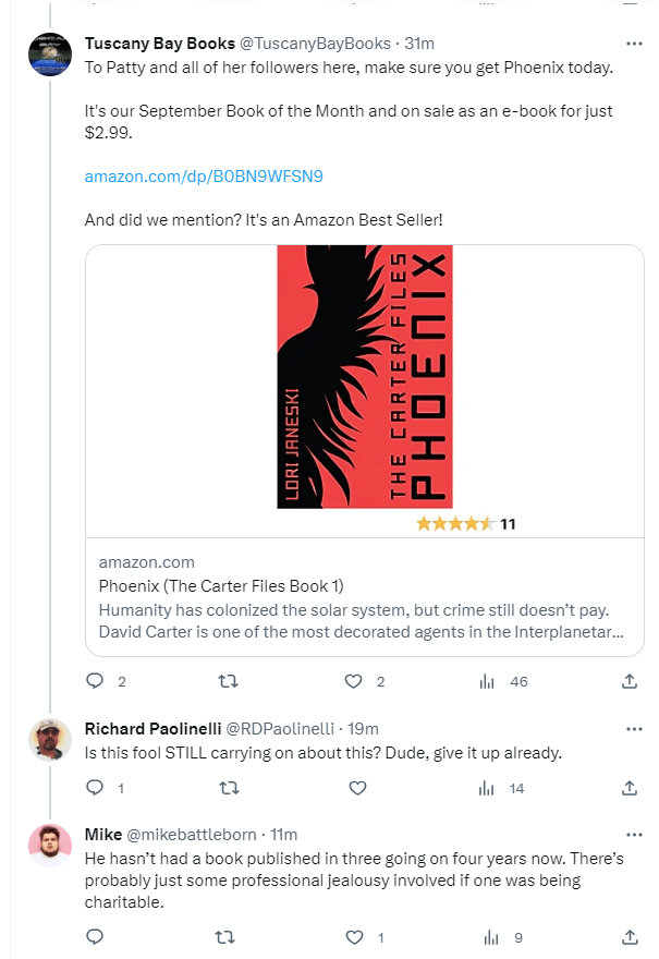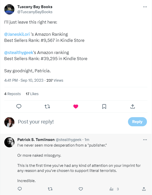 The result of this was that Tomlinson blocked me, Paolinelli, Tuscany Bay Books, AND Husband (and in Husband’s case, it only took that one question). Once again, he proves he can’t stand up to men; he just enjoys picking on women with low follower counts, the ones he thinks he can intimidate.