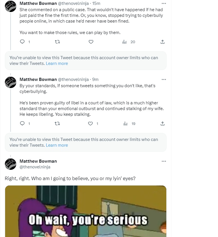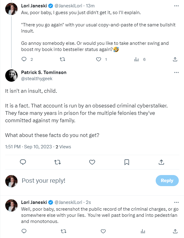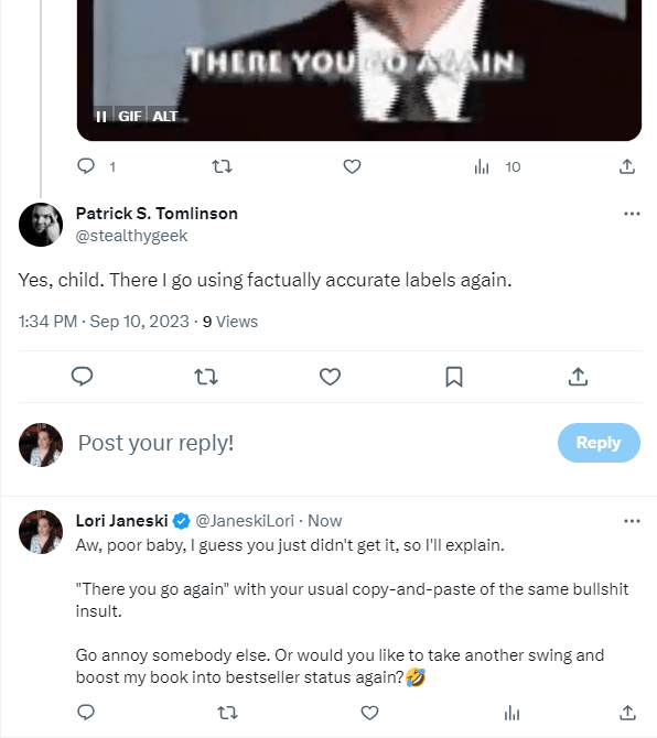 That’s true. In all these screenshots, I never once wandered out to Tomlinson’s own wall or posts or whatever Twitter wants to call it. I never tagged him in anything (although several other commentors did, and I commented there). Other than “poor baby,” I never called him any names (although I will admit to using his title of “Unstealthy Dork” after the fact, mostly to keep from getting him to unblock me and come back for Round . . . what would that be, five or so? I didn’t want his name to show up in a search and draw his eye), used any swear words, or wished him any harm.