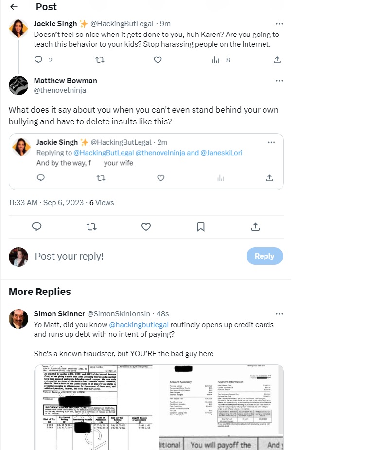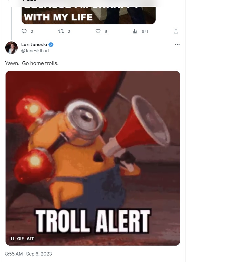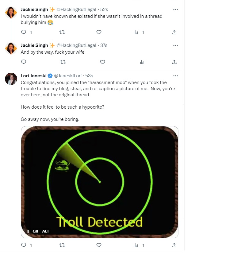 I still don’t wish him any harm. he’s obviously mentally disturbed about something, and several theories about why were floating around in other threads. I wondered if he fixated on me out of everyone in that original thread because I have a very slight resemblance to his ex-wife (not enough to make it uncanny; just barely). Other people said it was because I was a woman, and he goes after women more than men. Others said because I had a low follower count, he assumed I’d be easy pickings. Someone else said his mom used to tell him “don’t let the idiots win,” which was why he kept coming back for more, over and over and over again.