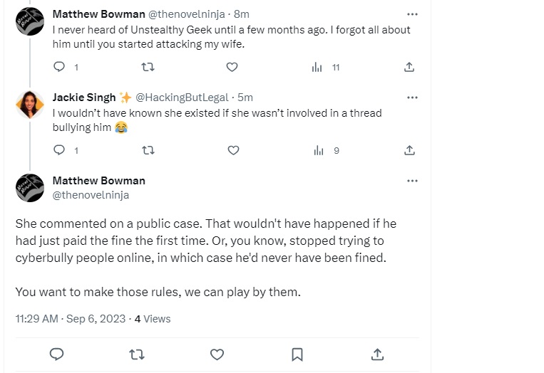 At which point, even though he SAID we were just mean liars, and didn’t know anything, and so forth and so on, Unstealthy Dork decides to come over to my thread (when I quoted and shared the above) and continue beating the dead horse: