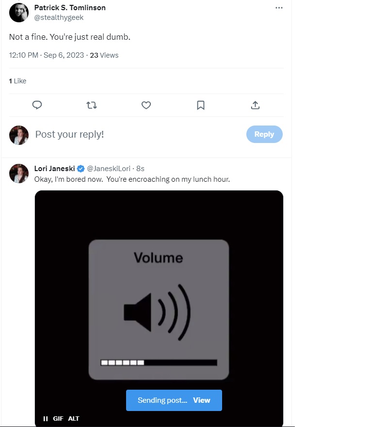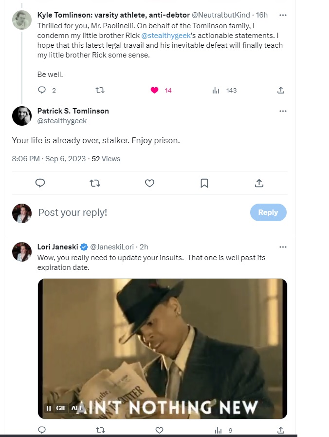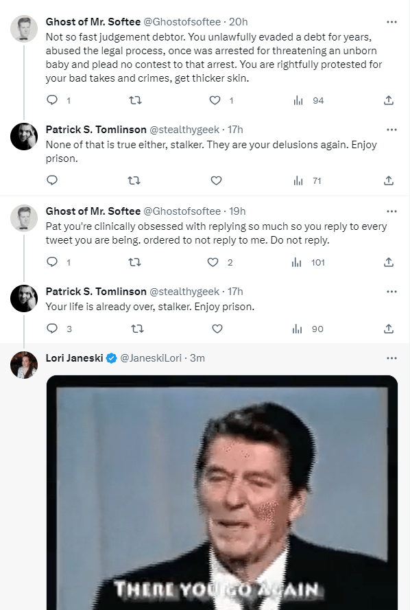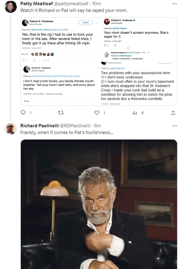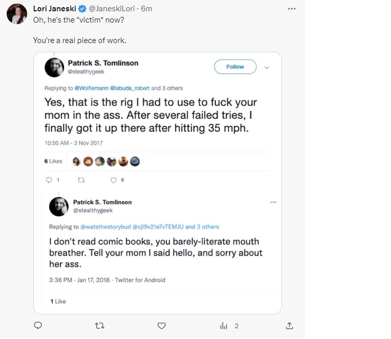 So, Tomlinson decided to shut up after that. I was watching, and taking screenshots (because if you get blocked by a troll, and comment on it elsewhere, then they can unblock you and call you a liar; yes, I learned that the hard way a while back). I might need an entire external backup drive just for all these screenshots, but it’s worth it.