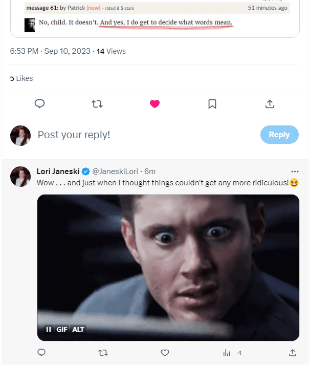 My favorite part (and oh, how I wish I’d done what I’d wanted to at the time), was how he seemed to think that an “insult” had to be also false, and that his insistence that “these are just facts” was sufficient to prove he wasn’t a liar. I wish I’d posted a screenshot of the definition of “insult” and let him stew in that a while, but alas, I muted the conversation.