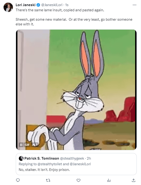 Once again, he had nothing to say but his usual drivel, and not even getting made fun of for using the “enjoy prison, stalker” insult over an dover, along with calling me “child,” could give him a hint to give up or go away. You don’t like me? Use the “block” function (while it lasts, at least). I also NEVER accused him. My only commentary was on the court case.