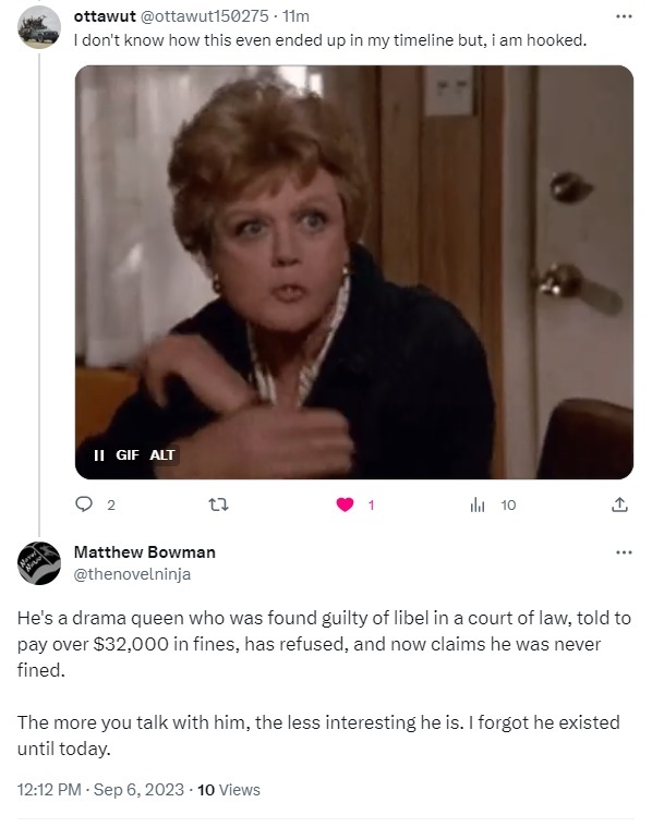 That last one (where I muted him) is missing a few prior comments (I know, shame on me, I thought I got the whole thing), but all I did was say that he did indeed lose the lawsuit, and posted a picture of the public record court judgment that had “paid” listed next to the amount and his name, along with the date.